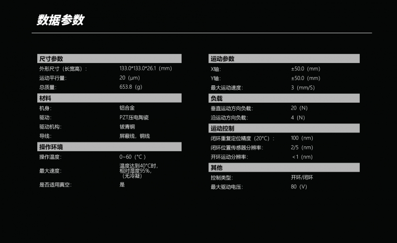 XYMF-133-100A平移臺實現了在XY二維空間上的準確定位,具有分辨率高,行程大(XY軸行程±50mm),帶有高精度及高分辨率的位置反饋。操作簡單,定位準確,能在真空下使用等優點,可應用于需要納米精度運動操作及定位的各個領域。