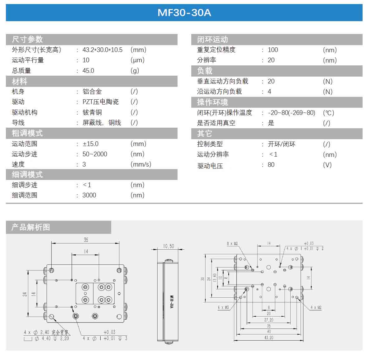 線性壓電位移臺-MF系列 MF30-30A 機身采用鋁合金材質,運動步進50-2000nm,細調范圍3000nm。