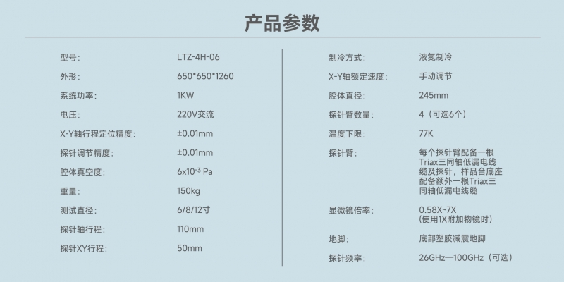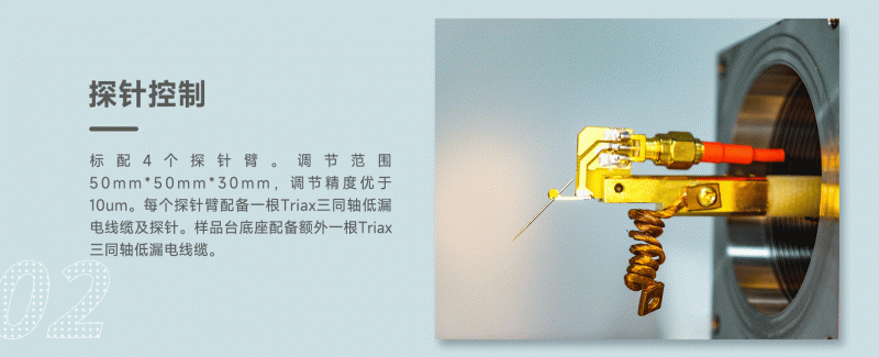 2. 探針控制:標配4個探針臂。調節范圍50mm*50mm*30mm,調節精度優于10um。每個探針臂配備一根Triax三同軸低漏電線纜及探針。樣品臺底座配備額外一根Triax三同軸低漏電線纜;