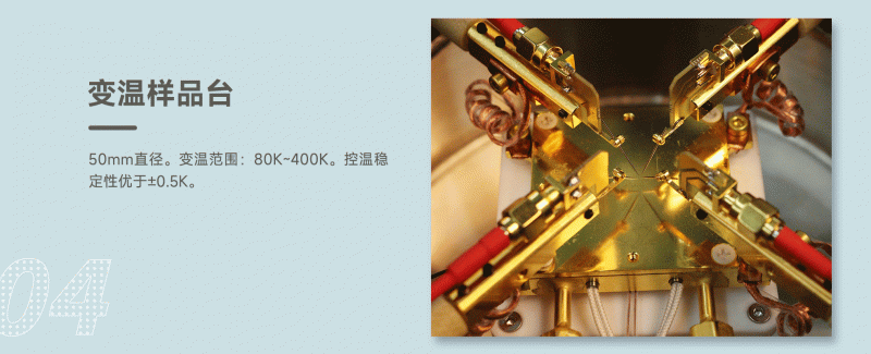4. 變溫樣品臺:50mm直徑。變溫范圍:80K~400K。控溫穩定性優于±0.5K;
